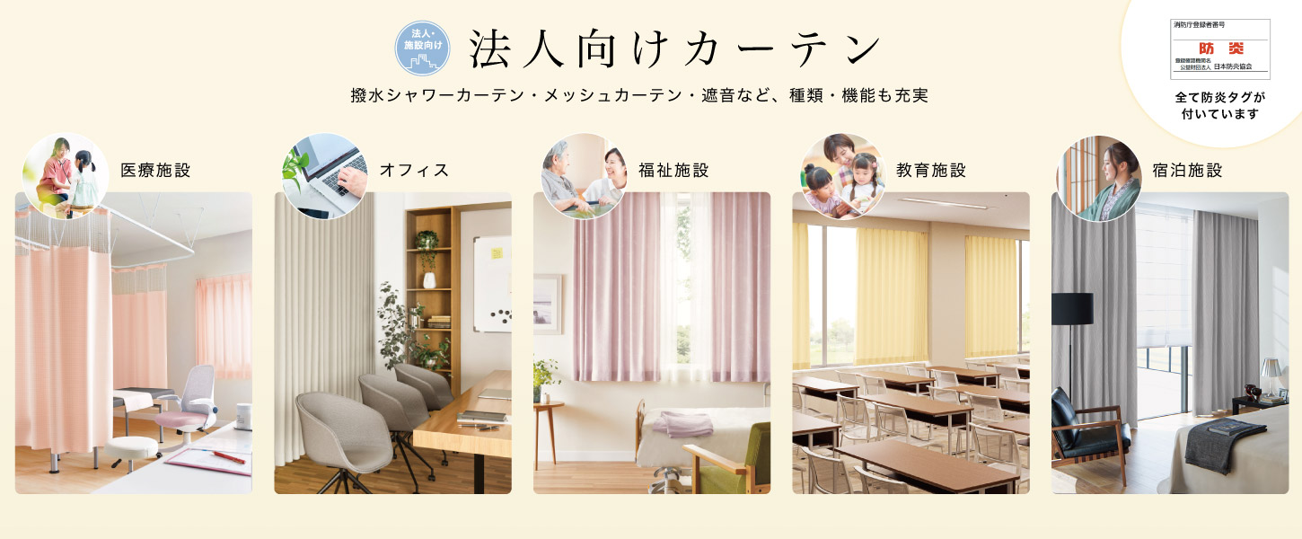 法人向けにおすすめなカーテンを集めています。全て防炎タグ付き。施設や場所別に分けて、探しているカーテンが見つかりやすくなるように分類しています。(全ラインナップ/84シリーズ・全348色(2026年2月現在))