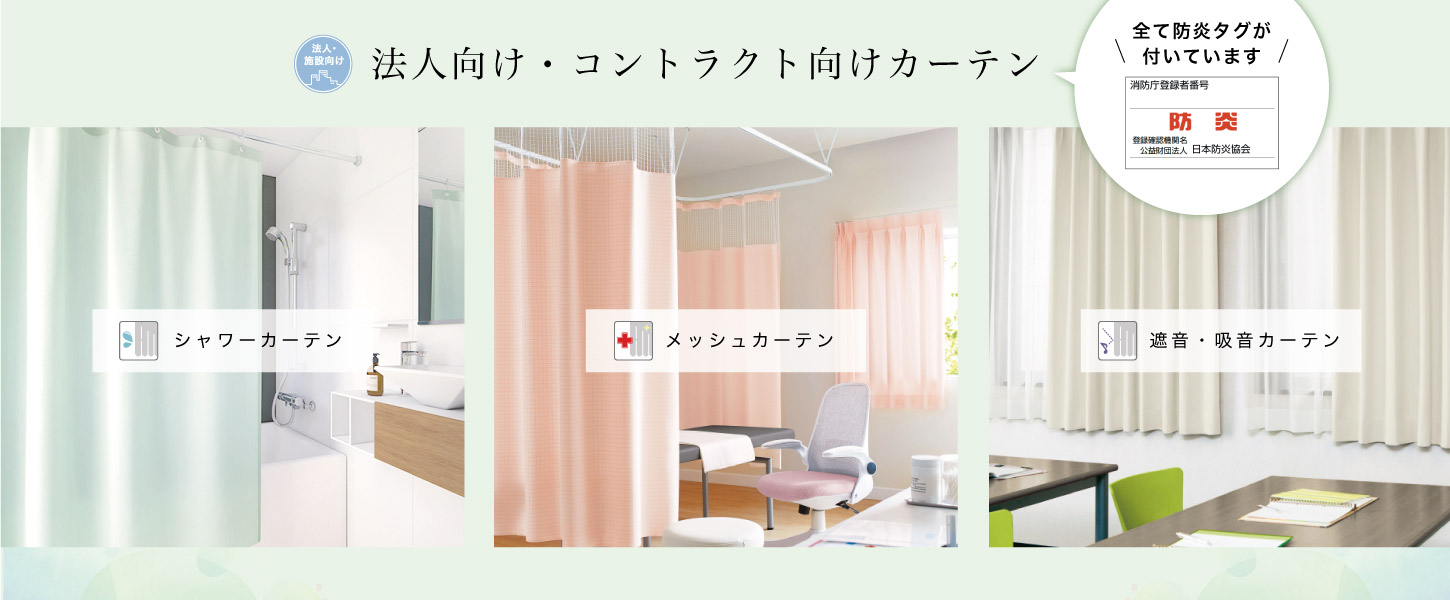 法人向けカーテン、公共施設など向けに考えられたコントラクト用のカーテンを集めています。施設や場所別に分けて、探しているカーテンが見つかりやすくなるように分類しています。(全ラインナップ 56シリーズ・全248色/2025年6月現在)