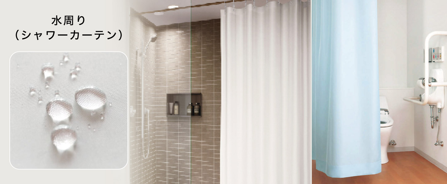 高齢者施設・介護施設の水回りに。はっ水加工のシャワーカーテン。