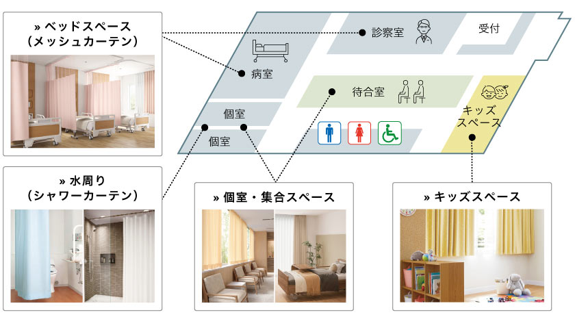 こちらのページでは、病院やクリニックなどの医療施設向けに、4つの場所のおすすめのカーテンをご紹介しています。
