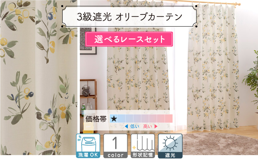 3級遮光【オリーブカーテン】+選べるお得なレースセット