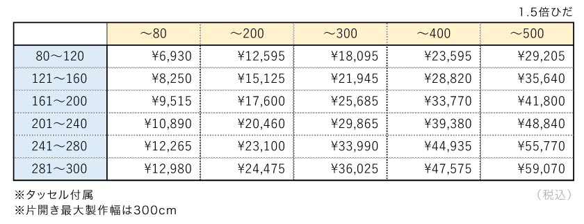 ※形態安定加工が施せるサイズは、丈・幅300cmまでとなります。(両開きの幅は600cmまで) 丈・幅300cm(両開きの幅は600cm)を超えるサイズは形態安定加工無しでの製作となります。