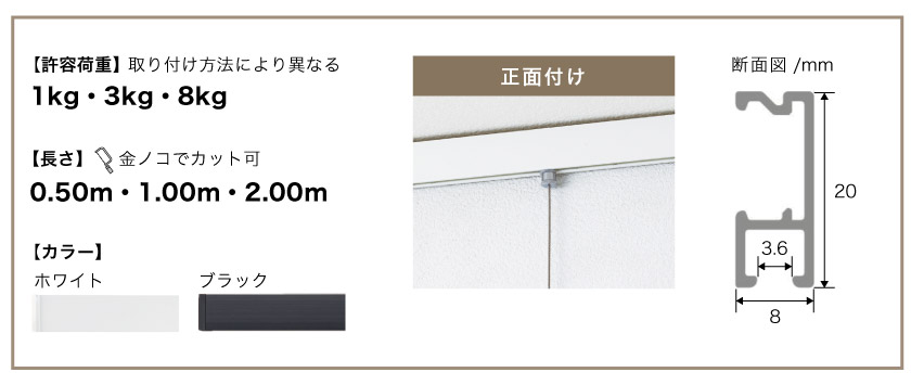 レールの色はホワイトとブラック。サイズは0.5m・1.0m・2.0mです。