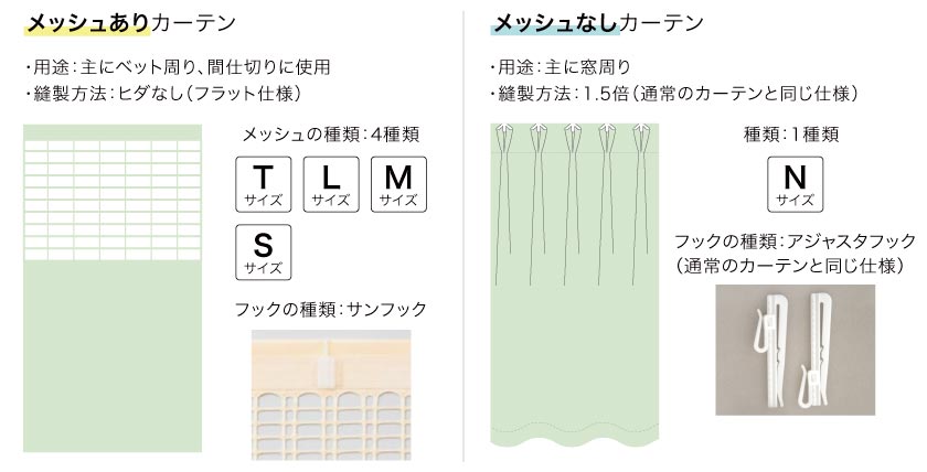メッシュ無しカーテンは1種類(Nサイズ)となります。通常のカーテンの仕様と同じです。