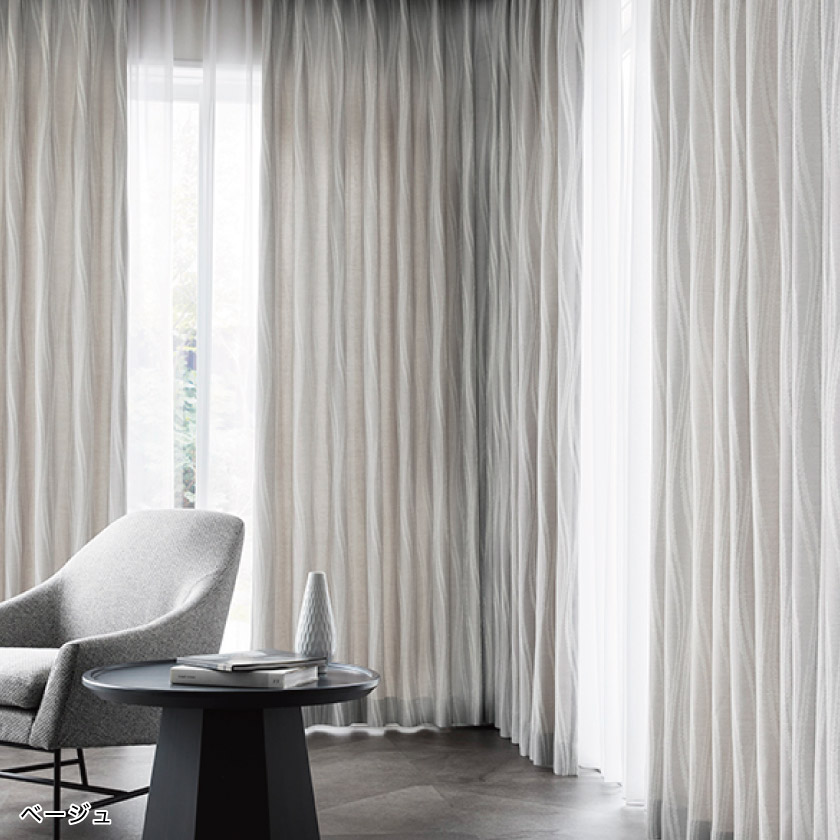 凹凸のあるウェーブを織り込んだカーテンです。薄いグレー系の2色で揃いました。モダンで、落ち着きのある仕上がりです。