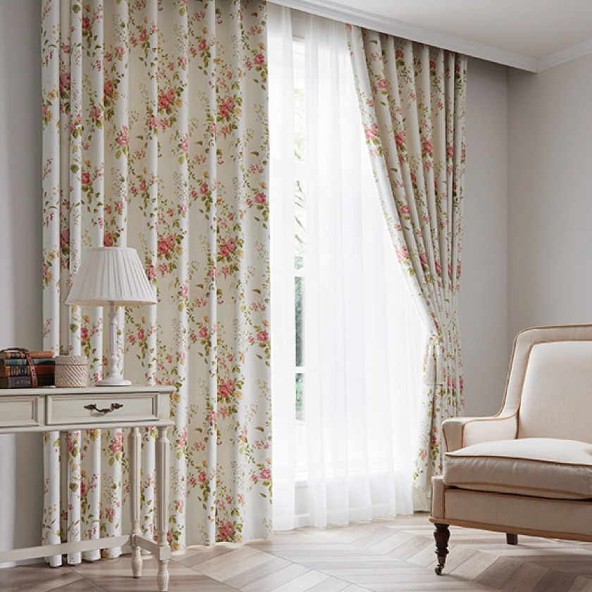 明るく華やかな印象に仕上げてくれる、生地全体に花柄プリントが入った、華やかな見た目の遮光2級カーテンです。生地表面は凹凸など無いフラットな生地です。