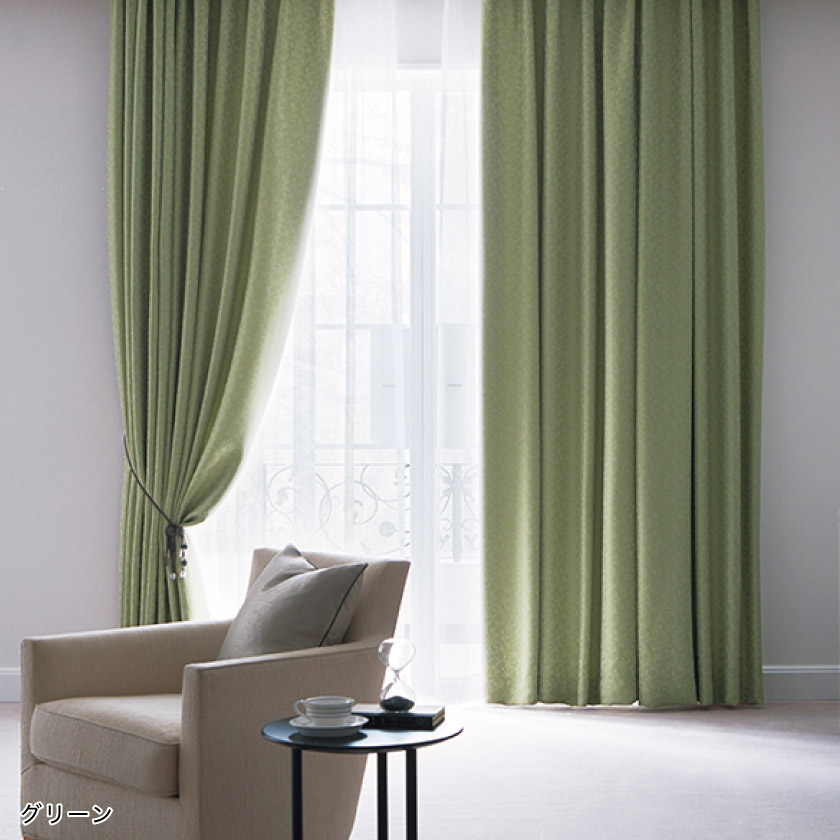 ベースの生地と同系色で唐草柄を織り込んだ、遮光2級カーテンです。空間によく馴染む、落ち着いた3色で揃いました。