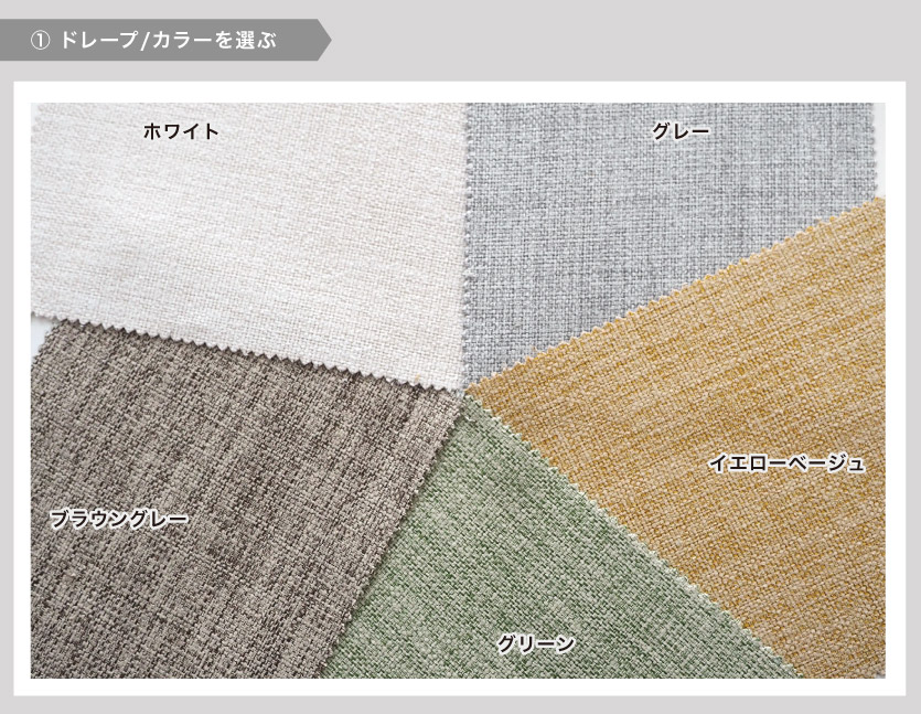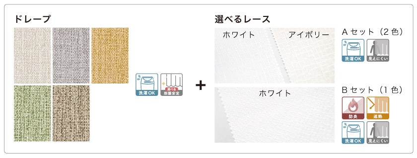 ドレープカーテンのカラーを選択して、レースは、当店オススメレース2種類からお選び下さい。カラーを選んで、開き方(両開きは4枚組、片開きは2枚組)とサイズを確定すれば、ご発注頂けます。