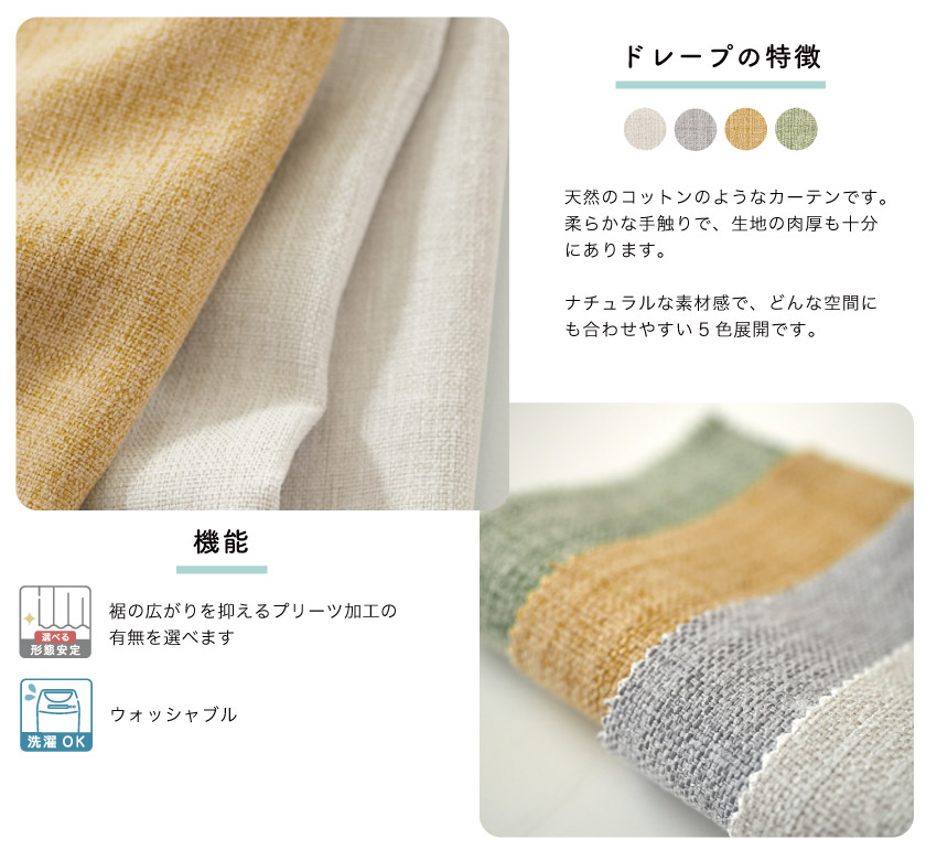 こちらのカーテンは、標準仕様:形態安定ありです。形態安定は、裾の広がりを抑えるプリーツ加工を施しており、ヒダがはっきりと出る仕上がりです。(耐洗濯性:3回程度)