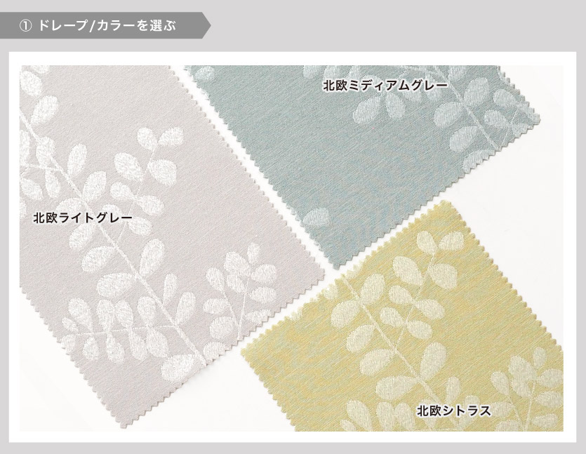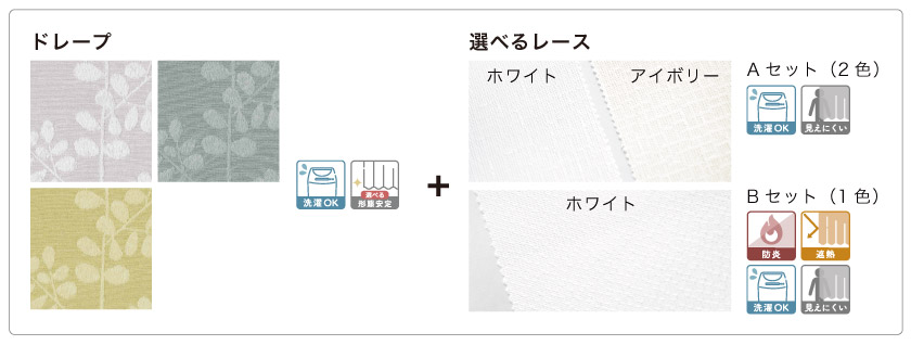 ドレープカーテンのカラーを選択して、レースは、当店オススメレース2種類からお選び下さい。カラーを選んで、開き方(両開きは4枚組、片開きは2枚組)とサイズを確定すれば、ご発注頂けます。