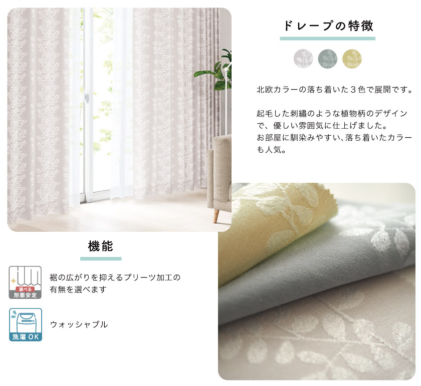 こちらのカーテンは、標準仕様:形態安定ありです。形態安定は、裾の広がりを抑えるプリーツ加工を施しており、ヒダがはっきりと出る仕上がりです。(耐洗濯性:3回程度)