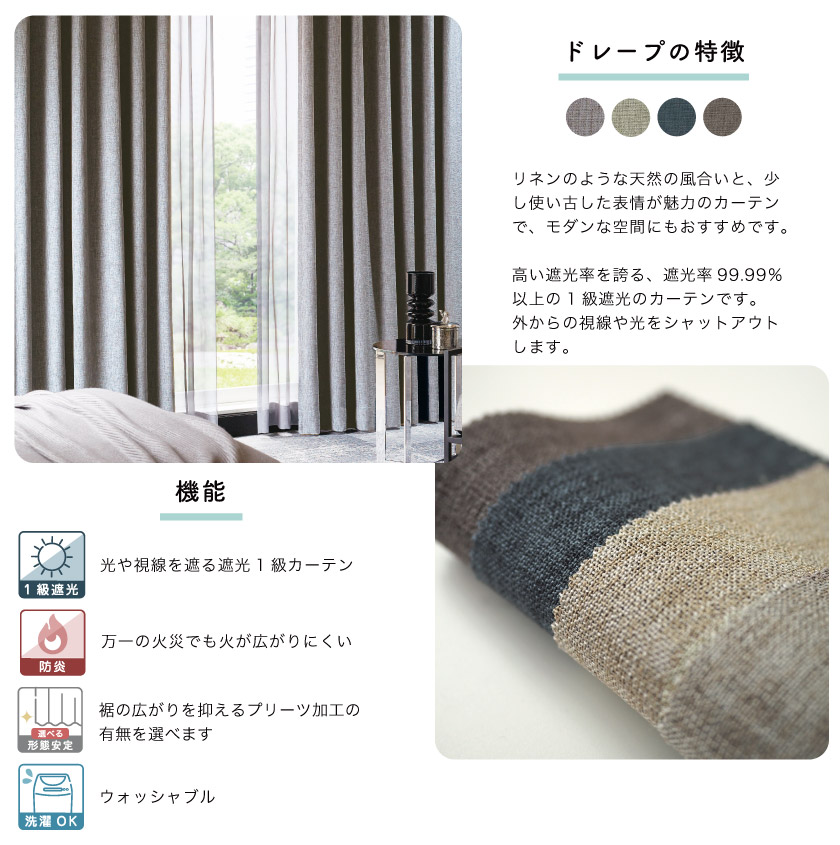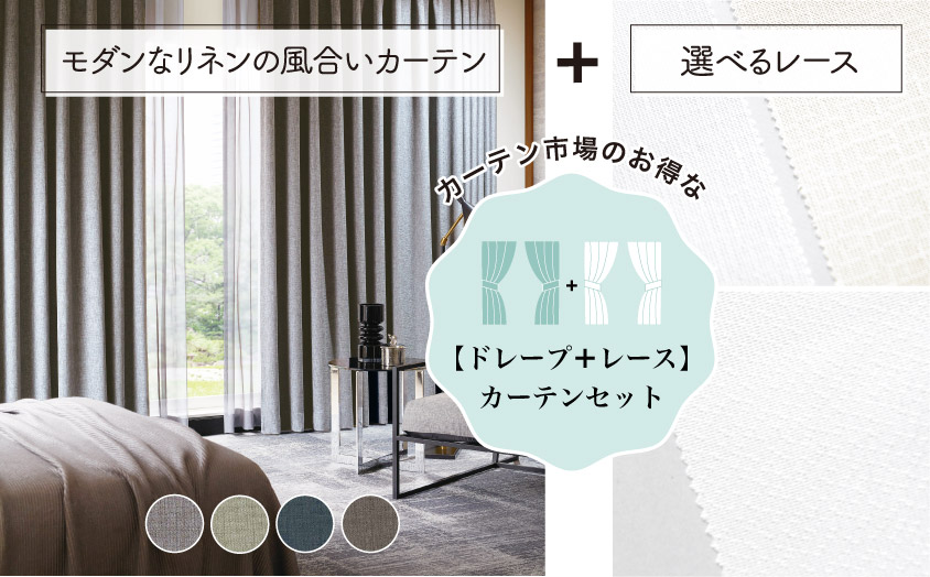 『1級遮光ドレープ【モダンなリネンの風合いカーテン 】+おすすめレース』セット