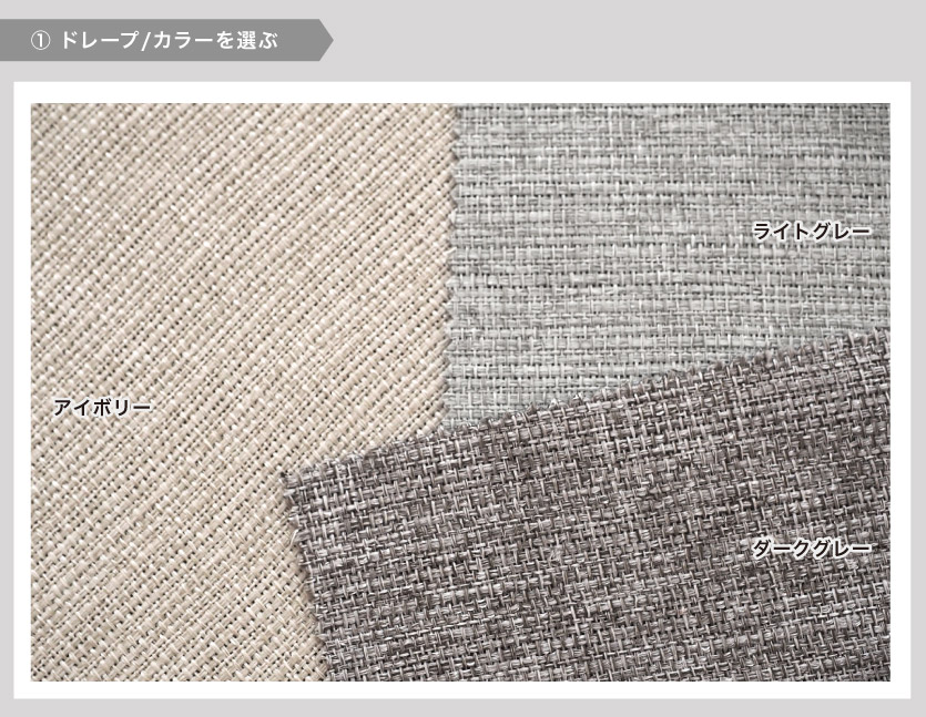 ドレープカーテンのカラーを選択して、レースは、当店オススメレース2種類からお選び下さい。カラーを選んで、開き方(両開きは4枚組、片開きは2枚組)とサイズを確定すれば、ご発注頂けます。