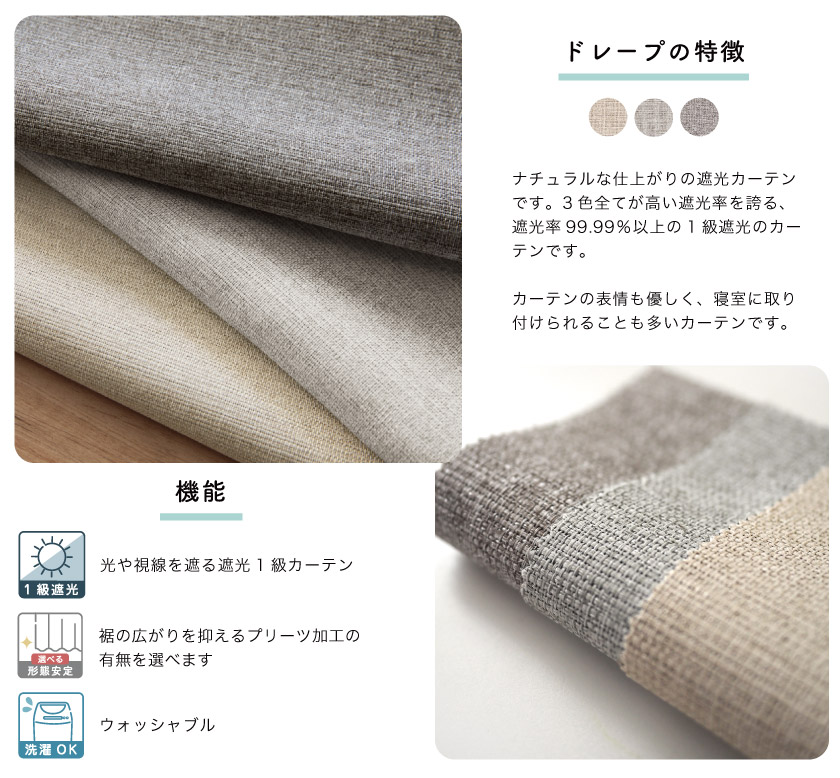 こちらのカーテンは、標準仕様:形態安定ありです。形態安定は、裾の広がりを抑えるプリーツ加工を施しており、ヒダがはっきりと出る仕上がりです。(耐洗濯性:3回程度)