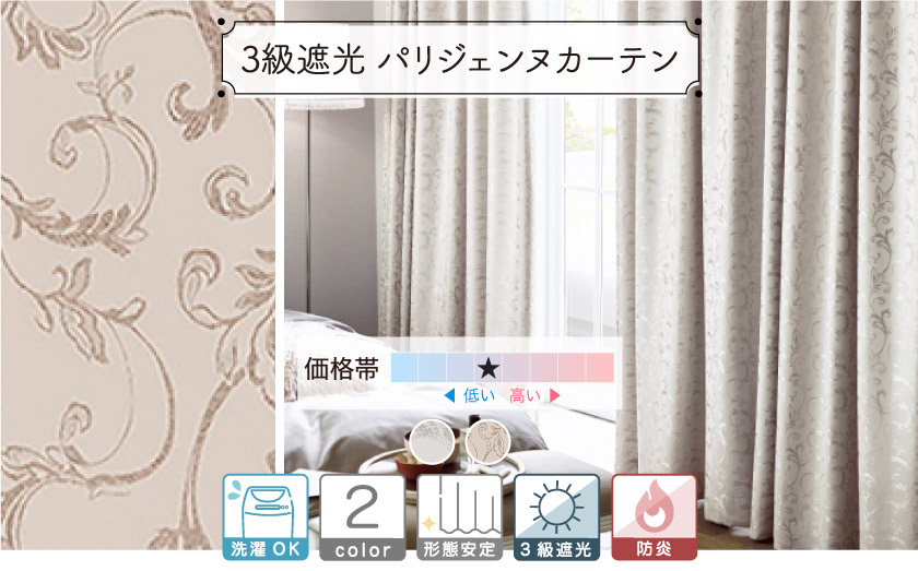 使い古した感じのヴィンテージな風合いより、「古さ」はもちろん大事にしつつも、大人の上品な落ち着いた雰囲気をプラスしたシャビーシック。経年変化した、白を基調にした家具に、フレンチ風味のパステルカラーで引き立てたり、生地のバリエーションも豊富で人気のテイストです。カーテンは白を基調として、パステルカラーの展開のあるものや、ポイントにゴールドやシルバーなど光沢感のある糸が使われているものなど、大人の可愛さを演出するカーテンが取り揃っています。